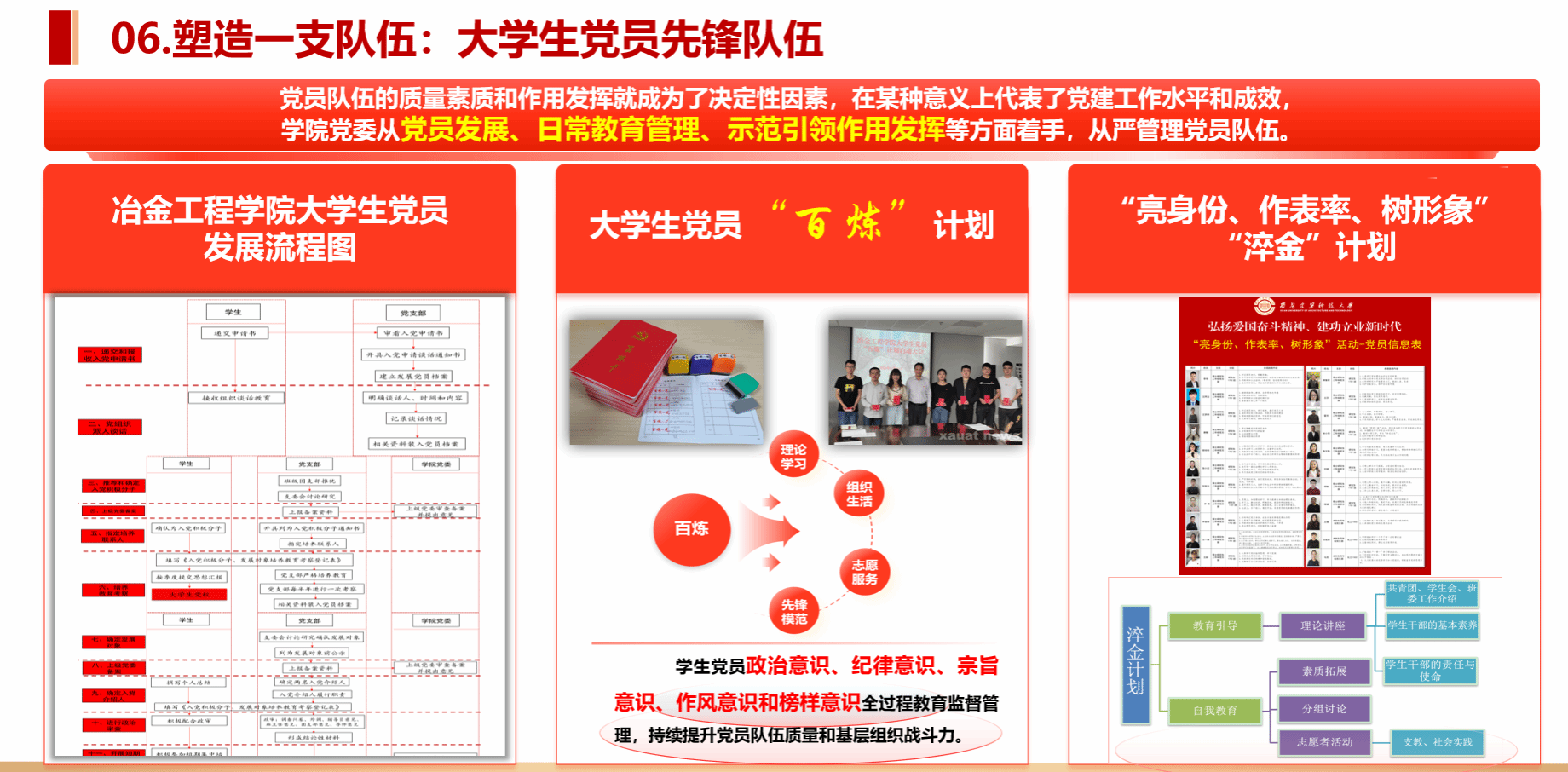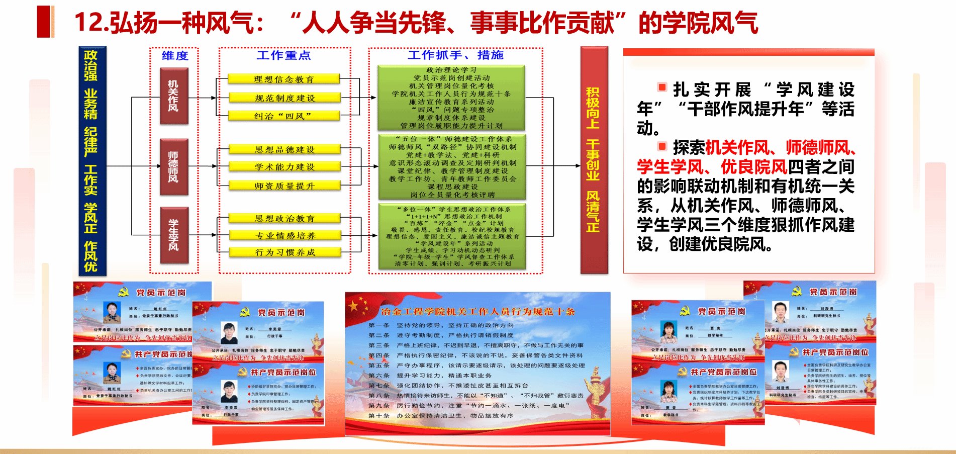 学院党委连续被评为“先进党委”,首批入选学校“党建工作示范学院”,获批“全省党建工作标杆院系”,成为全校第一个党建、团建省级“双标杆”创建学院,学院团委获“全国钢铁行业五四红旗团委(标兵)”。1个党支部入选“全国党建工作样板支部”,2个党支部入选“全省党建工作样板支部”,4个党支部入选校“党建工作样板支部”,获批“双带头人”教师党支部书记工作室2个。一流专业、一流课程、国家级人才、国家自然科学基金重点项目、国家重大科研仪器研制项目、国家重点研发计划项目都实现新突破。连续荣获“年度考核优秀学院”,荣获“陕西省师德建设先进集体”荣誉称号。