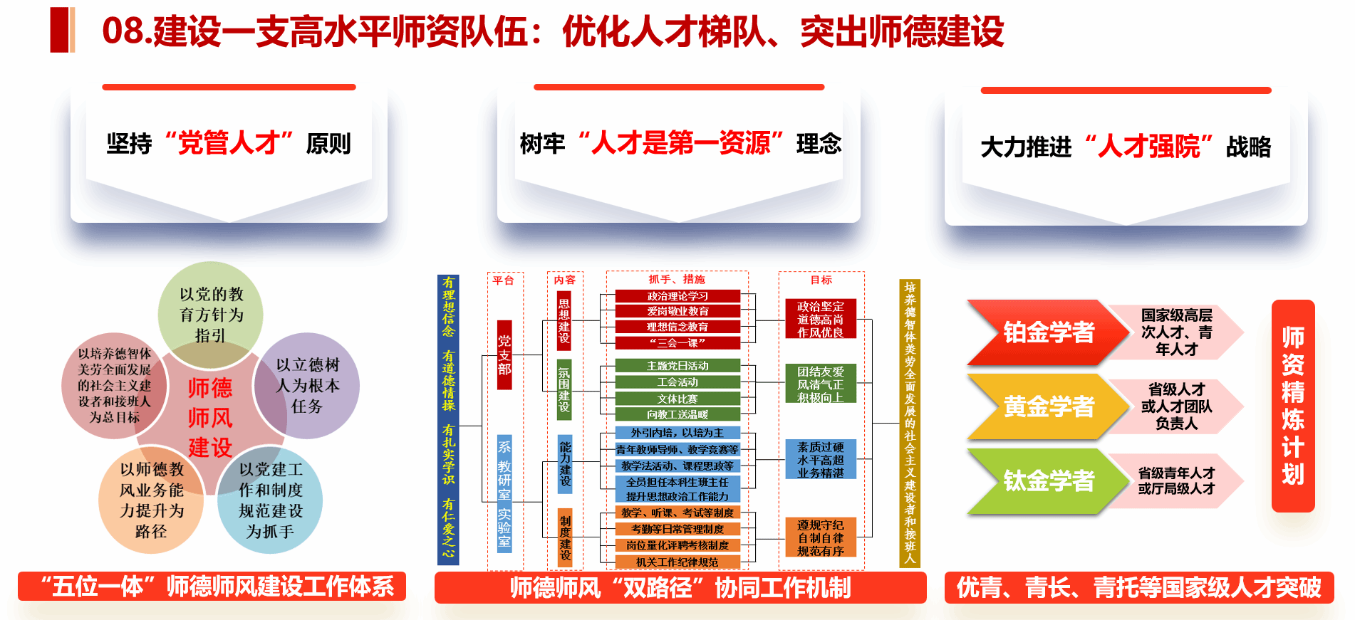 党建工作实施路径是以强化党委的政治核心和对学院改革建设发展的引领作用为出发点,以旗帜鲜明、方向正确、改革有效、建设有序、发展有力为落脚点,在领导班子、支部党员和全体师生三个层面推动党建工作。
