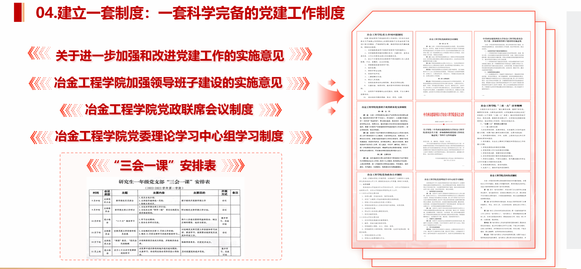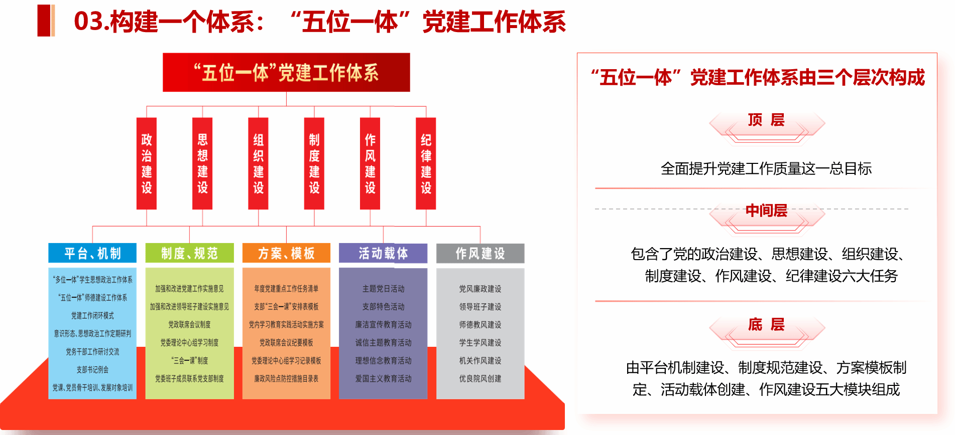 学院党委围绕着党的建设六大任务。确立了“以党的政治建设为统领,以思想、组织、作风、纪律、制度建设为保障,以平台构建、活动载体搭建为切入点,以系统协同推进为工作路径,以实现党建工作内涵式发展和学院事业持续进步为总目标”的“五位一体”党建工作体系。