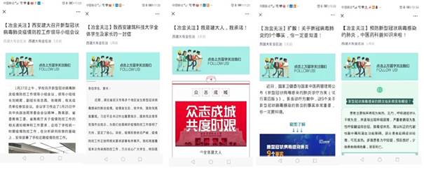 全体教师的一封信》等内容,把学校对师生的关心关切传递给每一个人。通过“西建大有金在冶”微信公众号等平台大力开展新型冠状病毒肺炎的防控知识普及与健康教育宣传,引导师生员工科学理性看待疫情发展进程,积极支持、配合学院及学校有关部门做好疫情防控工作,不造谣、不信谣,不传谣,团结一心,共抗疫情。