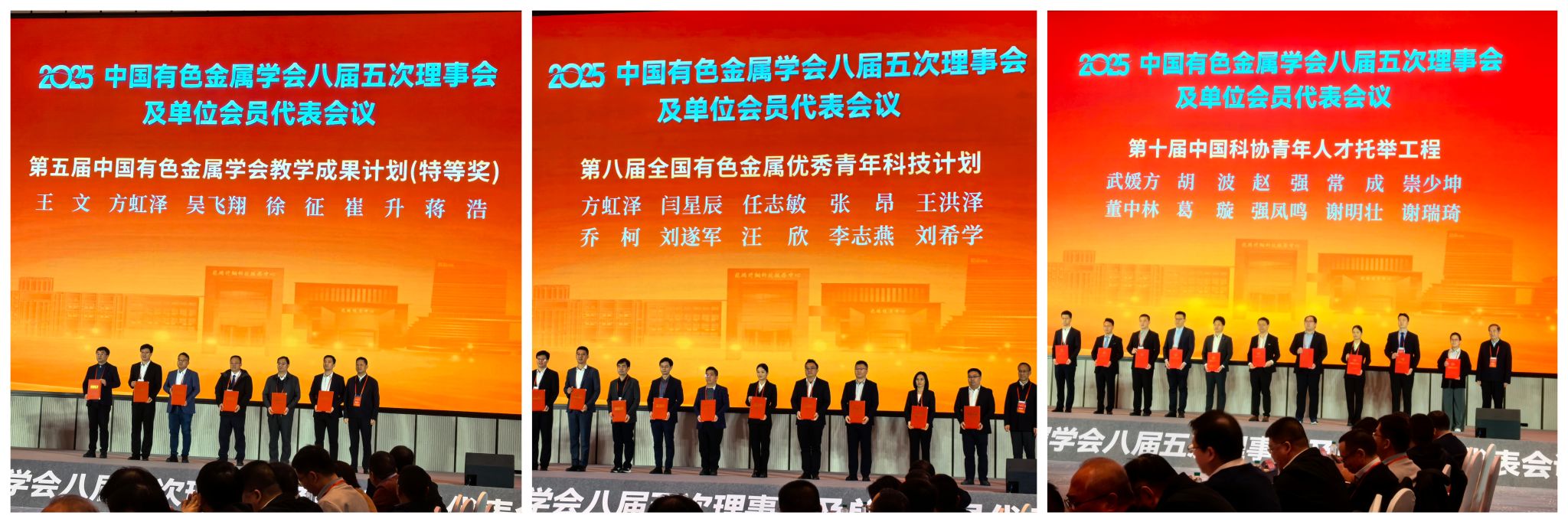 我院教师凭借突出的教学成果与科研实力斩获佳绩,王文教授荣获第五届全国有色金属学会教学成果特等奖,乔柯副教授入选第八届全国有色金属优秀青年科技计划,会议还表彰了第十届中国科协青年人才托举工程入选者强凤鸣等有色金属领域优秀青年人才。