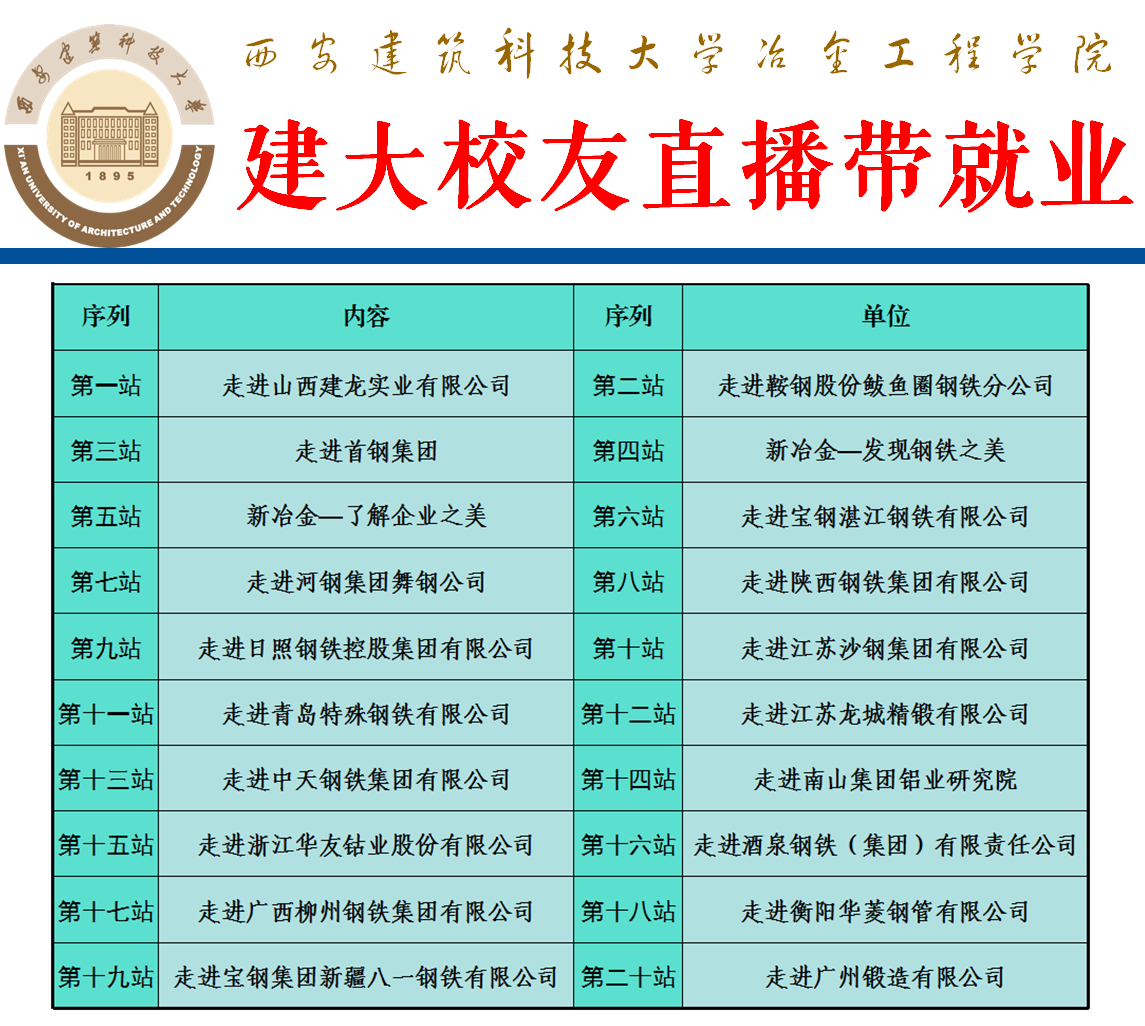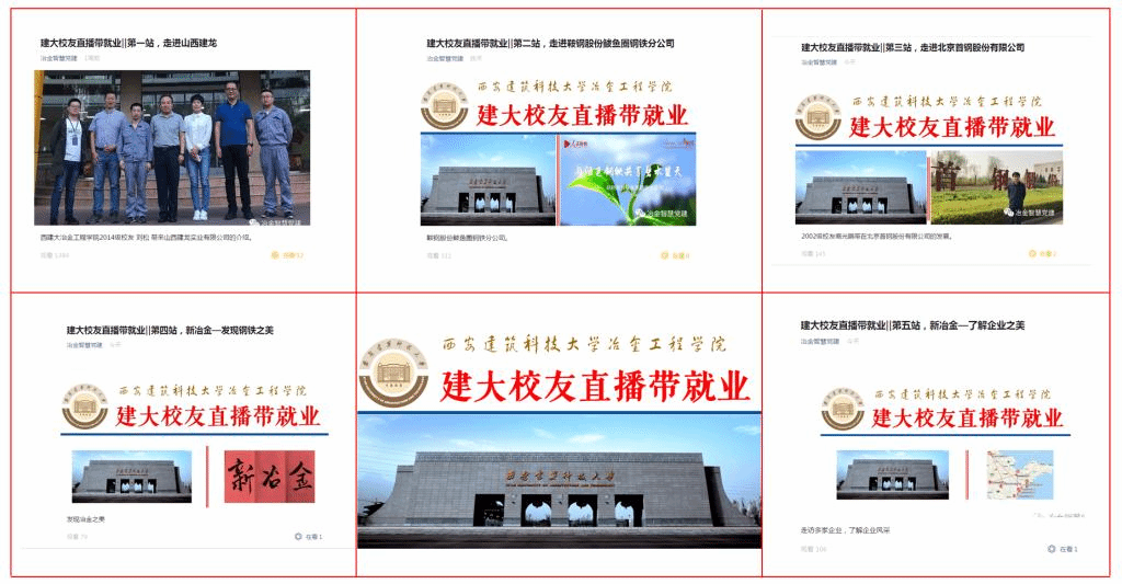 近期,通过学校学院网站、“有金在冶”“冶金智慧党建”微信公众号、校友群、各年级学生和家长微信群等平台,持续推送“建大校友直播带就业”活动系列视频,进一步扩大影响。视频一经播出,广大在校生和学生家长反响强烈,纷纷表示对所学专业和未来就业前景更为明确,专业自信心有所增强;已签约毕业生同学对未来就业环境、个人职业发展有了更为深入的了解,为进入行业就业、在国民经济主战场建功立业奠定了坚实的思想基础。