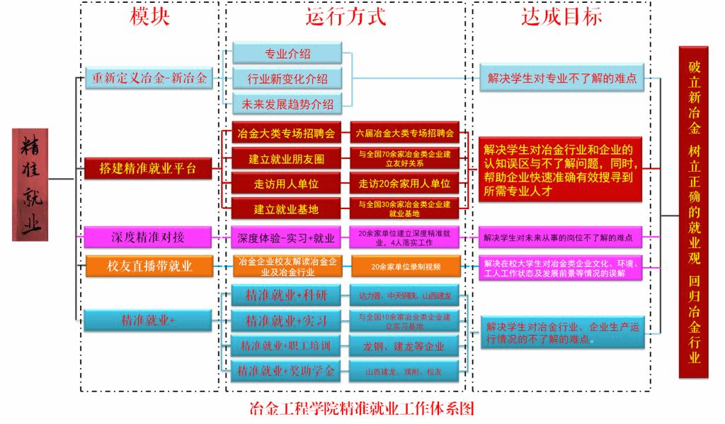 围绕“稳步提高就业率、持续提升就业质量”工作理念,针对冶金类专业学生择业就业中出现的认知偏差和现实问题,陆续构建了“精准就业(冶金大类)专场招聘会”“建大校友直播带就业”“重新认知定义新冶金”“精准就业+实习”“精准就业+职工培训”“精准就业+奖助学金”等就业工作服务平台,逐步形成了“长期稳定、精准高效、校企双赢”的就业工作体系。