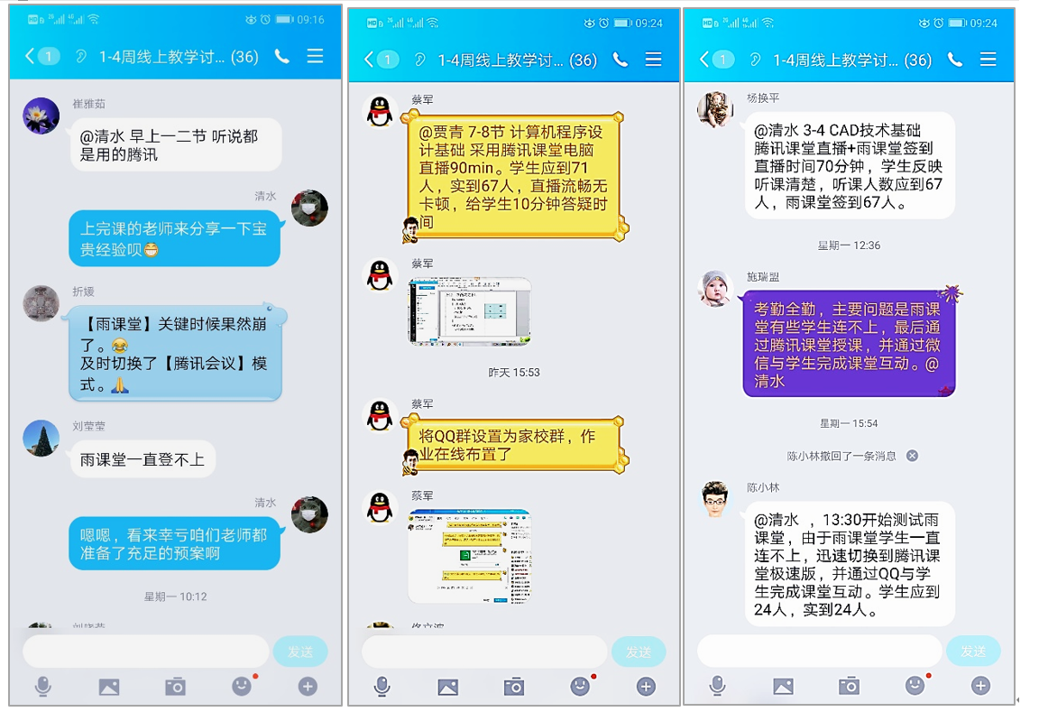 每个上完课的老师都及时在学院专门成立的讨论组里分享了自己的体验,并提出了很多的建议,例如:教师和学生在上课时均佩戴耳机可以避免回音,利用微助教可以规避学习通等平台的拥堵等。老师们相互鼓励,相互帮助,共同探讨,由于前期准备充分,所有课程进展平稳有序。