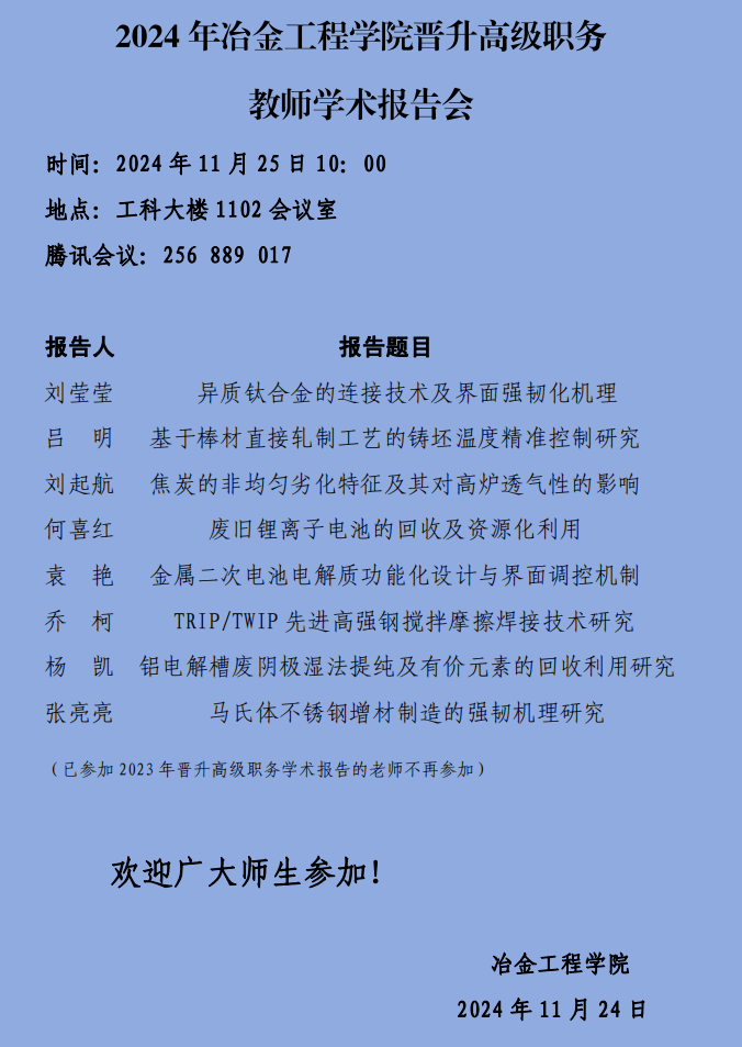 教师职务评审工作实施办法》(西建大冶金〔2024〕9号)和《关于做好2024年度职称评审前期工作的通知》等文件要求,学院11名老师经过个人申请、代表性成果同行评语、师德师风审核等环节后,学院组织8名教师参加(其中已参加2023年晋升高级职务学术报告的老师不再参加)教师系列晋升高级职务学术报告会。