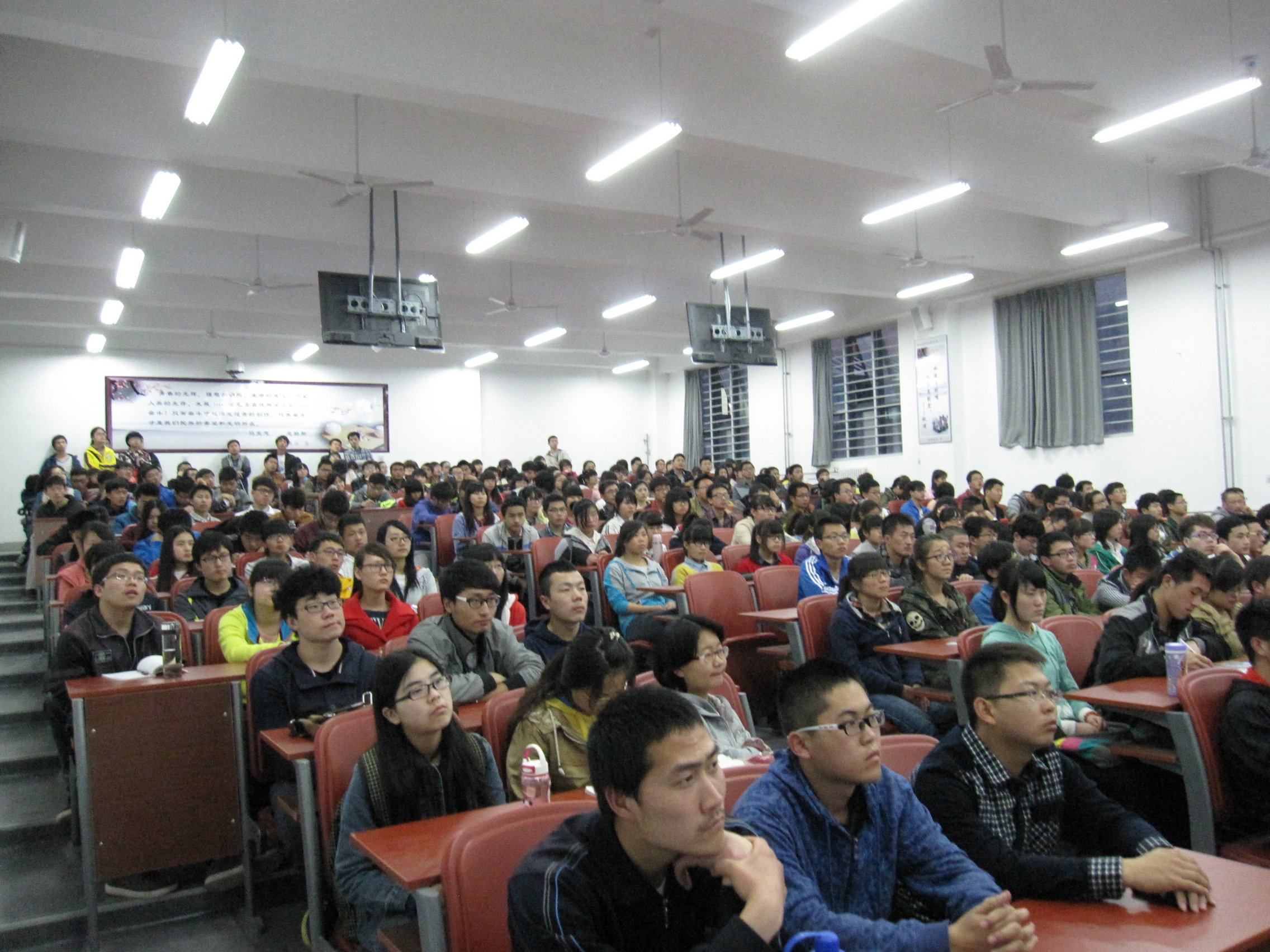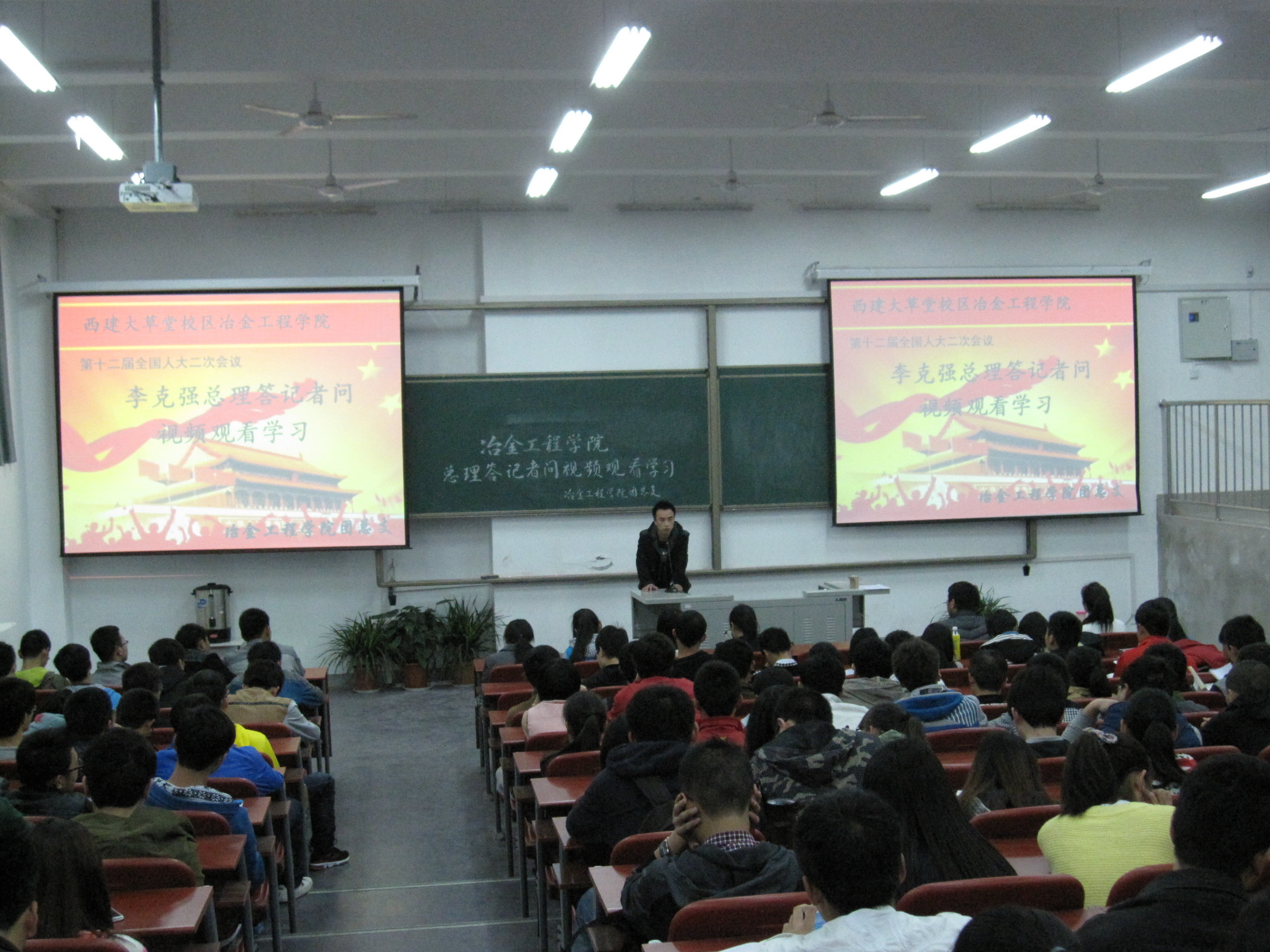 大会伊始,主持人对本次活动举行的意义进行了简要说明。随后播放了“两会”闭幕后“总理答记者问”的视频。视频的主要内容是李克强总理对近期国家发生的重大事件、两会内容、国家和政府的重要决策进行详细阐述,同时总理认真具体地回答中外记者对我国民生、环境和社会保障等热点话题的提问。大会进行过程中,同学们专注观看视频,认真做笔记。