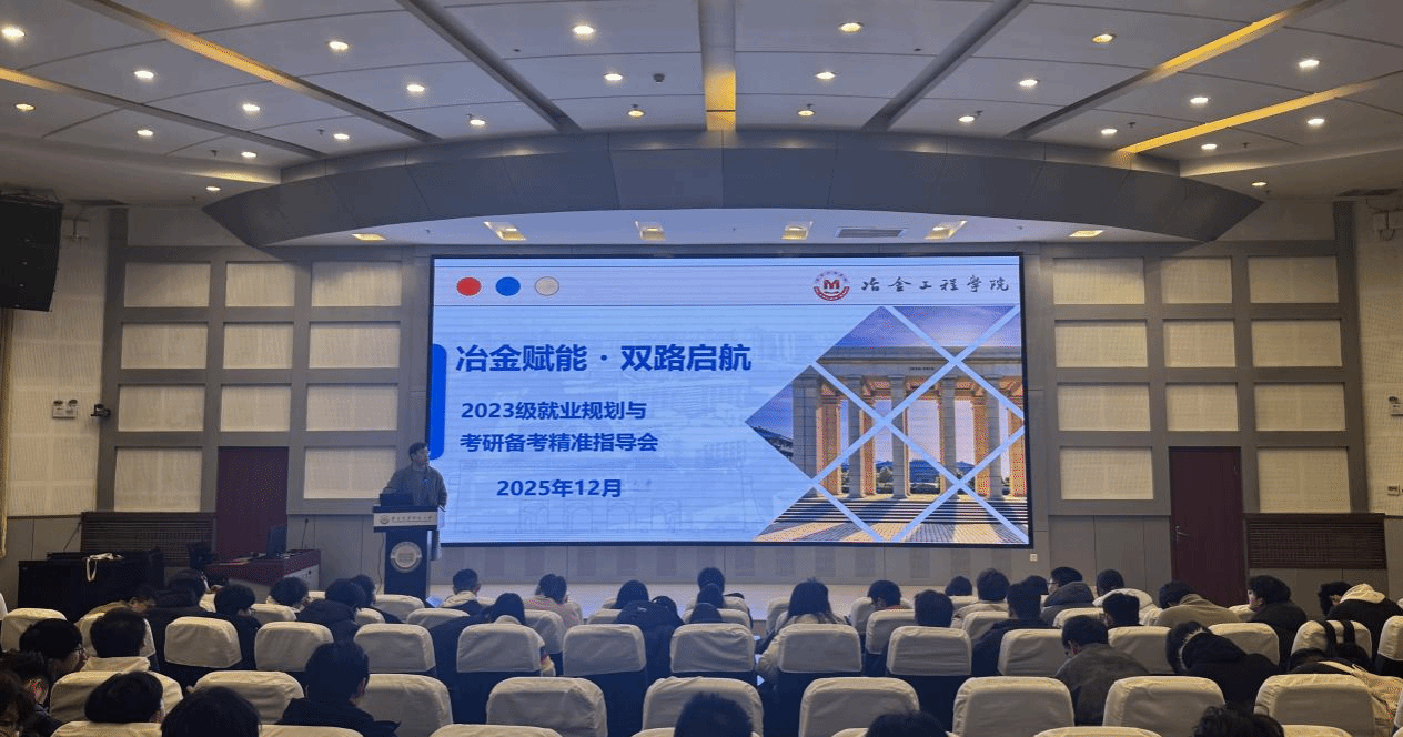 于12月3日在雁塔校区工科楼一楼报告厅召开2023级本科生年级大会,大会以“冶金赋能・双路启航”为主题,围绕就业规划与考研备考展开讲解。会议由23级辅导员岳家新主持,邀请尚研考研吴妮、新东方刘宇杰、好胜教育廖虎三位资深讲师作专题分享,23级全体本科生参与本次大会。