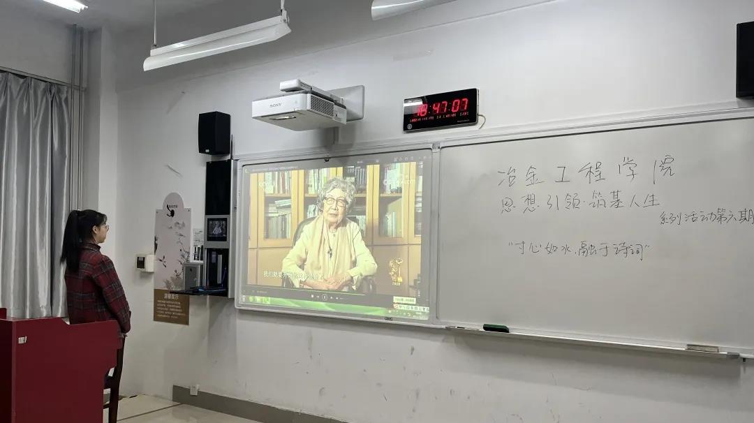 活动伊始,主持人向同学们介绍了叶嘉莹先生。叶嘉莹是诗词的女儿,是风雅的先生,也同样是中国古典文化的传播者。接下来,主持人为同学们播放了三段视频。第一段视频讲述了叶嘉莹先生颠沛流离的一生。1941年,叶嘉莹专攻古典文学专业时,母亲的去世带给她沉重的打击,在哀痛中,她写下了早期作品《哭母诗》。1948年,她与丈夫迁居台湾,但丈夫因各种原因被捕,全家仅靠她一人养活。1974年,叶嘉莹先生终于回归祖国的拥抱。然而好景不长,在她回国后不久,她就接到了大女儿夫妇因车祸遇难的噩耗。但叶嘉莹没有被现实打败而是将悲痛写成诗慰藉自己。第二段视频讲述了叶先生一辈子教书育人的故事。她教过的学生上至八十岁,下至九岁,他们都是因为叶先生才走进了中国古代诗词的大门,听叶先生的课,仿佛身临其境,令听者为之喜为之悲。第三段视频中叶嘉莹被评为“感动中国2020年度人物”。她经历了幼年丧母,中年丧子,国家动荡,但这些并没有击溃她,而是令她更热忱于中国古典文化的传播,耗费金钱和精力去传授知识,只为让世人感受到中国古典文化的魅力。
