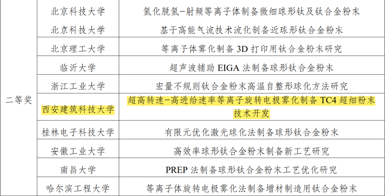 作品名称:超高转速——高进给速率等离子旋转电极雾化制备TC4超细粉末技术开发