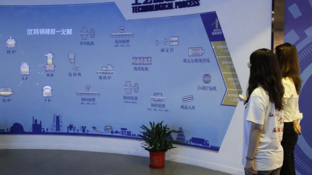 随后,小队随讲解员移步至第二展厅,在这里,两位成员了解中天钢铁集团的历史变迁:中天钢铁集团原名武进轧钢厂,2001年由国企变为私企,在钢铁行业前景惨淡的时期,董才平董事长积极改革,革新技术,使中天站稳脚跟。